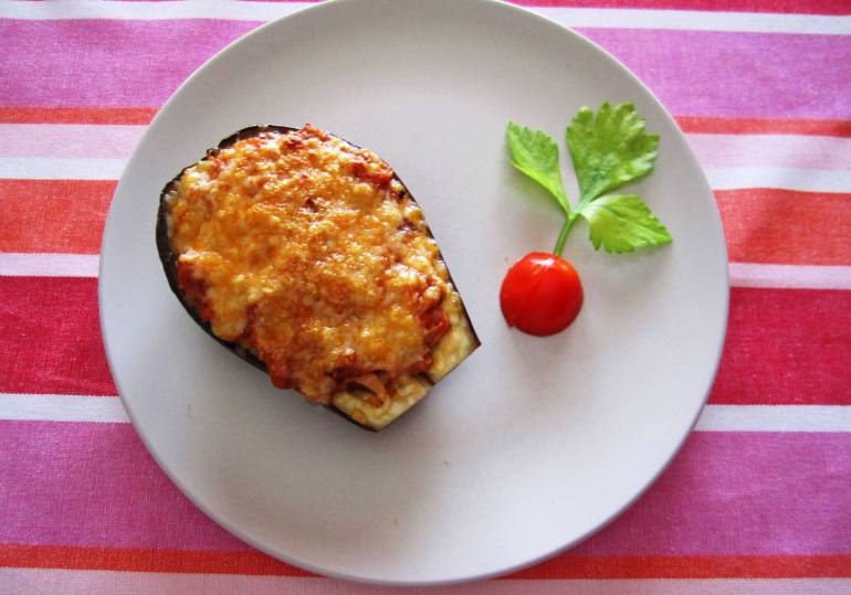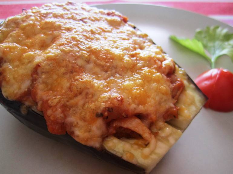 8. Retira la varoma, añade en el vaso el atún y mezcla 2 segundos, velocidad 3. Coloca las berenjenas con la piel hacia abajo en una fuente para el horno y rellena con la mezcla del vaso, cubre con queso rallado y ya puedes gratinar unos minutos en el horno.