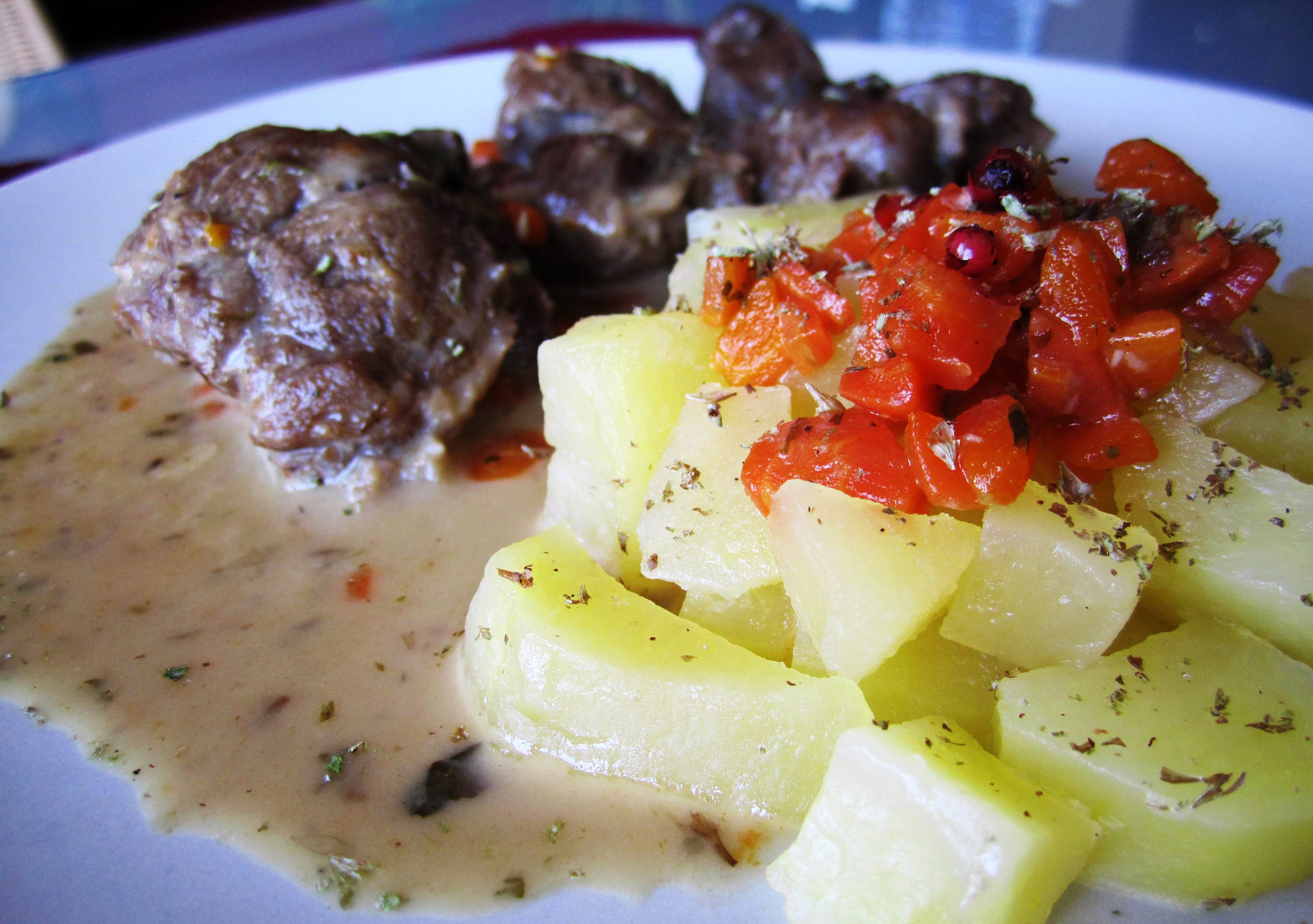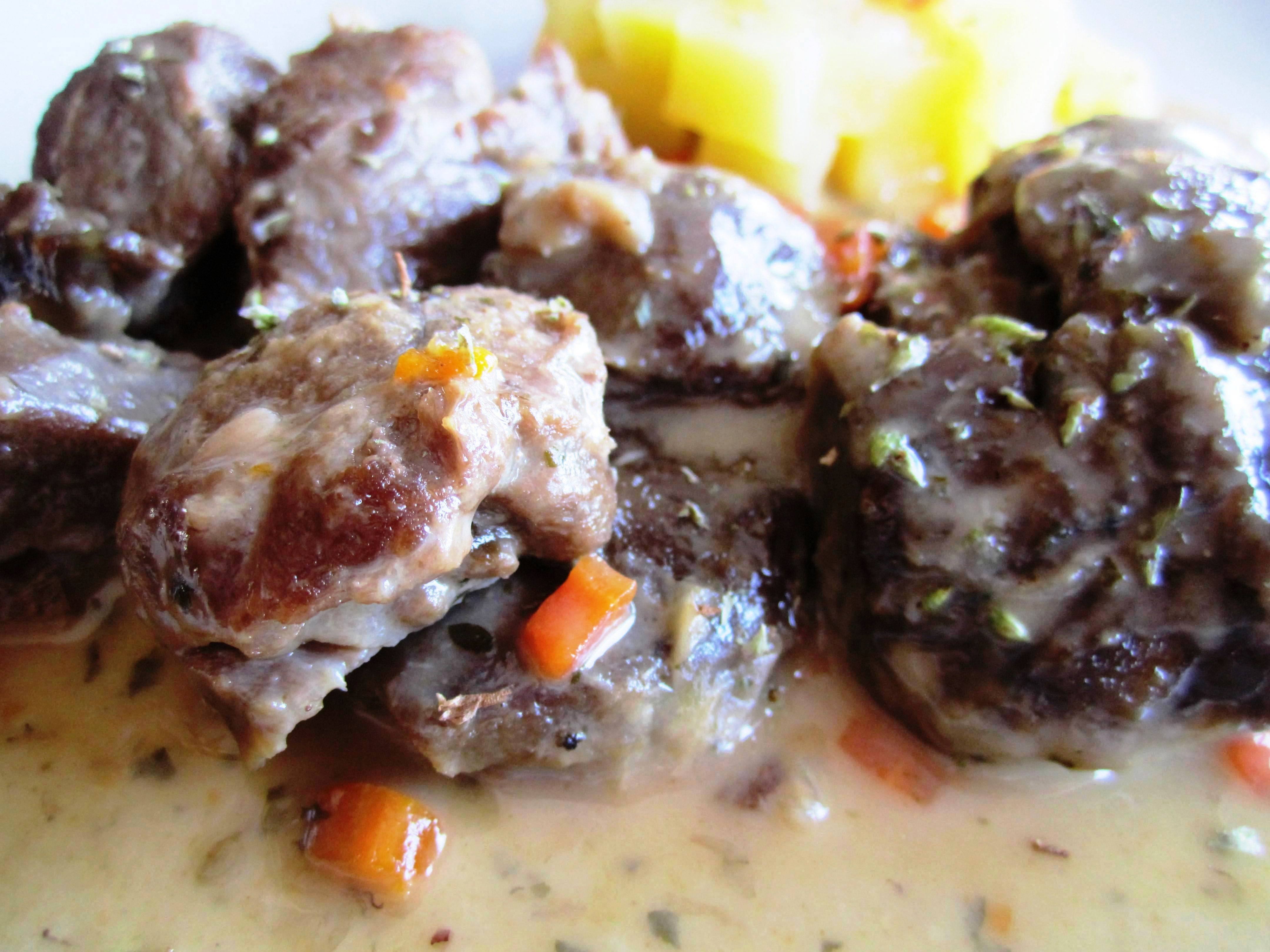 6. Retira el varoma, comprueba si la carnes esta lo suficientemente melosa, sino es así puedes programar 15 minutos mas, varoma, giro a la izquierda, velocidad cuchara. Sirve con las patatas y las zanahorias de acompañamiento.