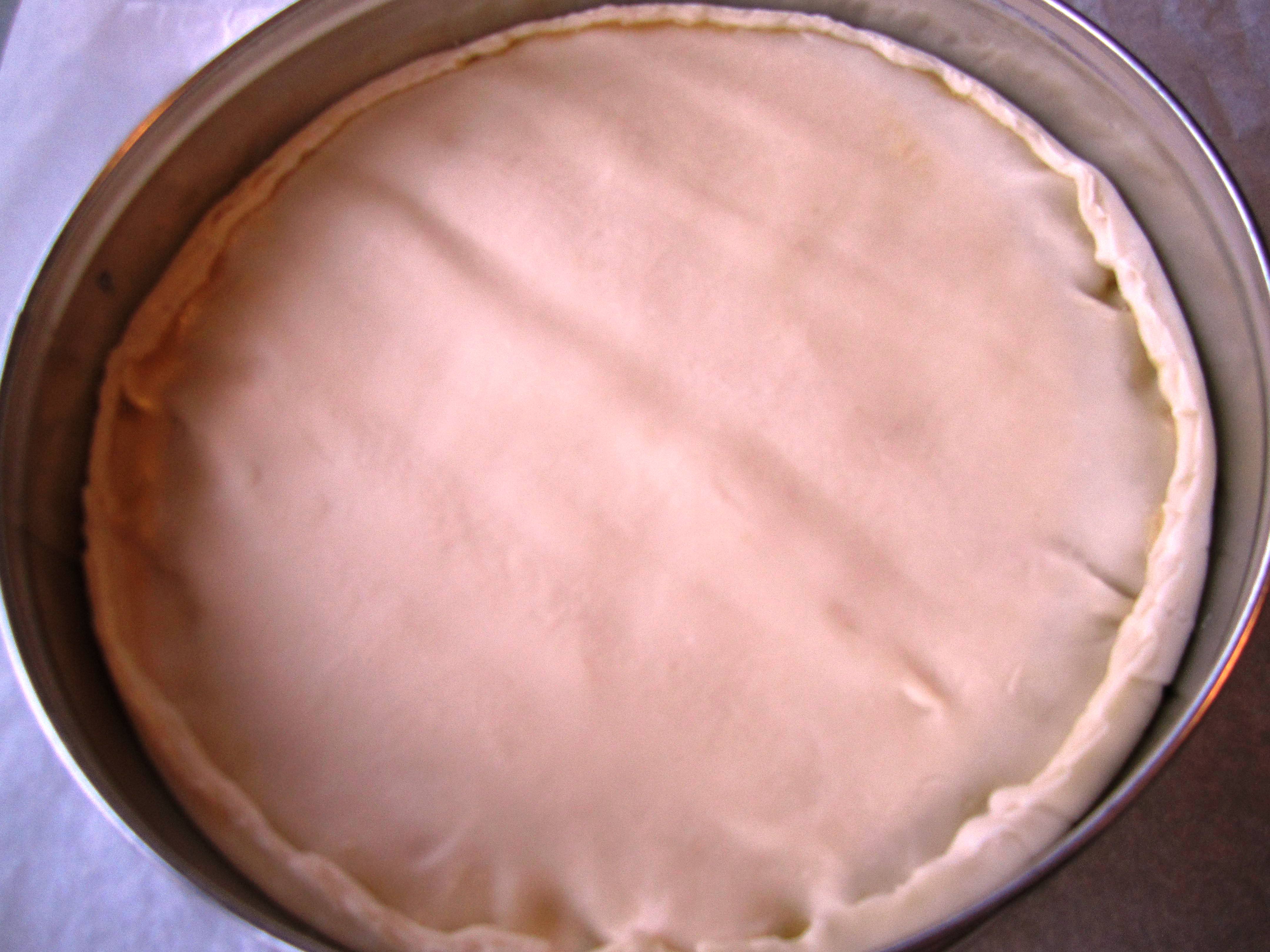 6. Con la otra masa forra el molde cuidadosamente; si ya tienes la mezcla de la tortilla fría, vértela dentro y extiéndela bien , coloca la tapa de hojaldre con cuidado, séllala y píntala con el huevo batido para que tenga un bonito color dorado al hornearse.