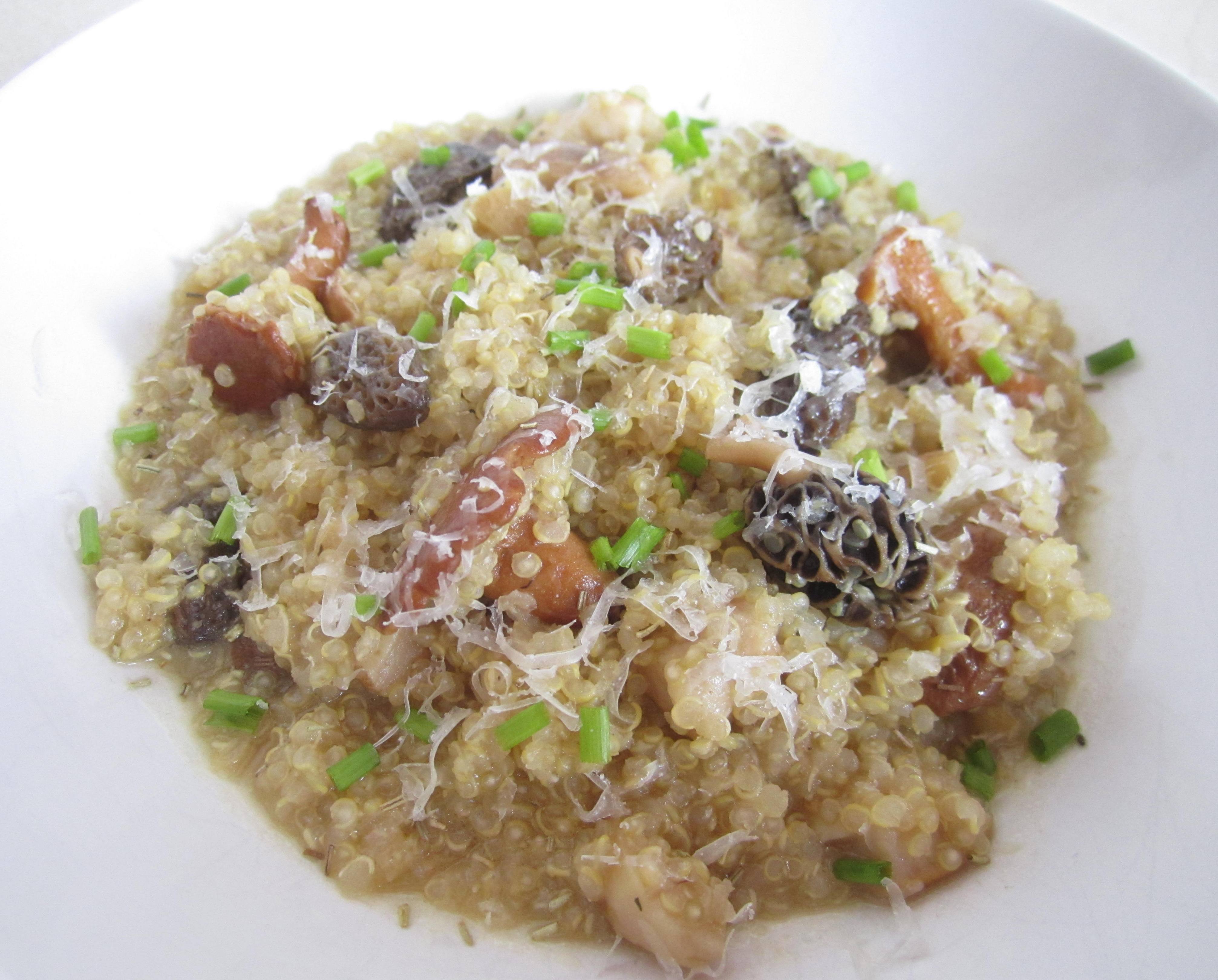 Últimamente me he aficionado a tomar Quinoa y estoy todo el día pensando nuevas formas para cocinarla. Hoy me puesto a experimentar y he preparado esta especie de risotto y me ha gustado muchísimo, espero que a vosotr@s también. A diferencia del arroz la quinoa mantiene su textura después de llevar un rato preparada y es posible reservar un poquito para otro momento sin ningún problema, lo único que tienes que evitar es poner el queso hasta el momento de comer y listo.
