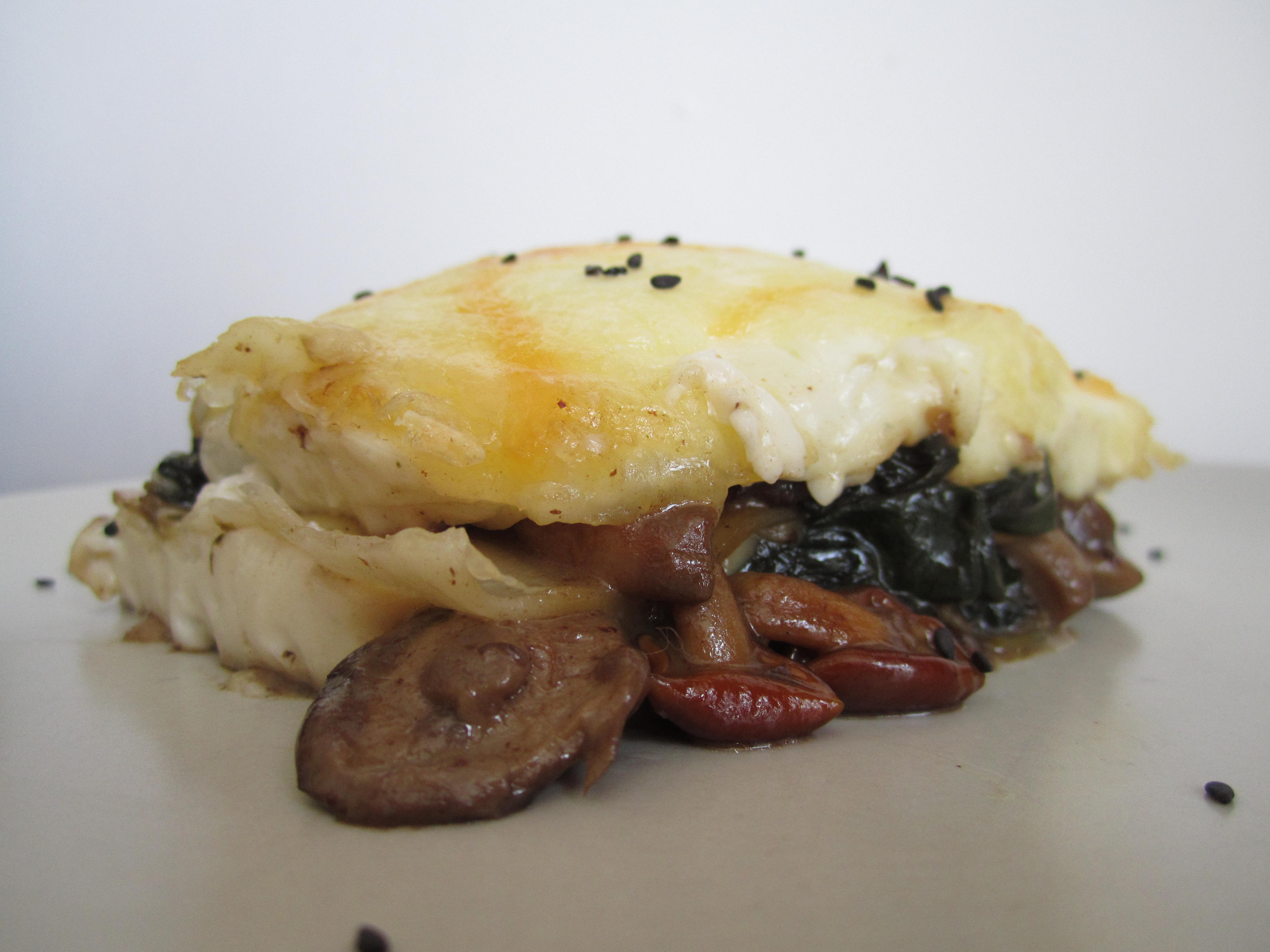 2. En la fuente (que se pueda meter en el horno) engrasada con un poco de mantequilla o aceite, colocamos 3 placas de lasaña, pon la mitad de la mezcla de las espinacas y las setas, y reparte bien.