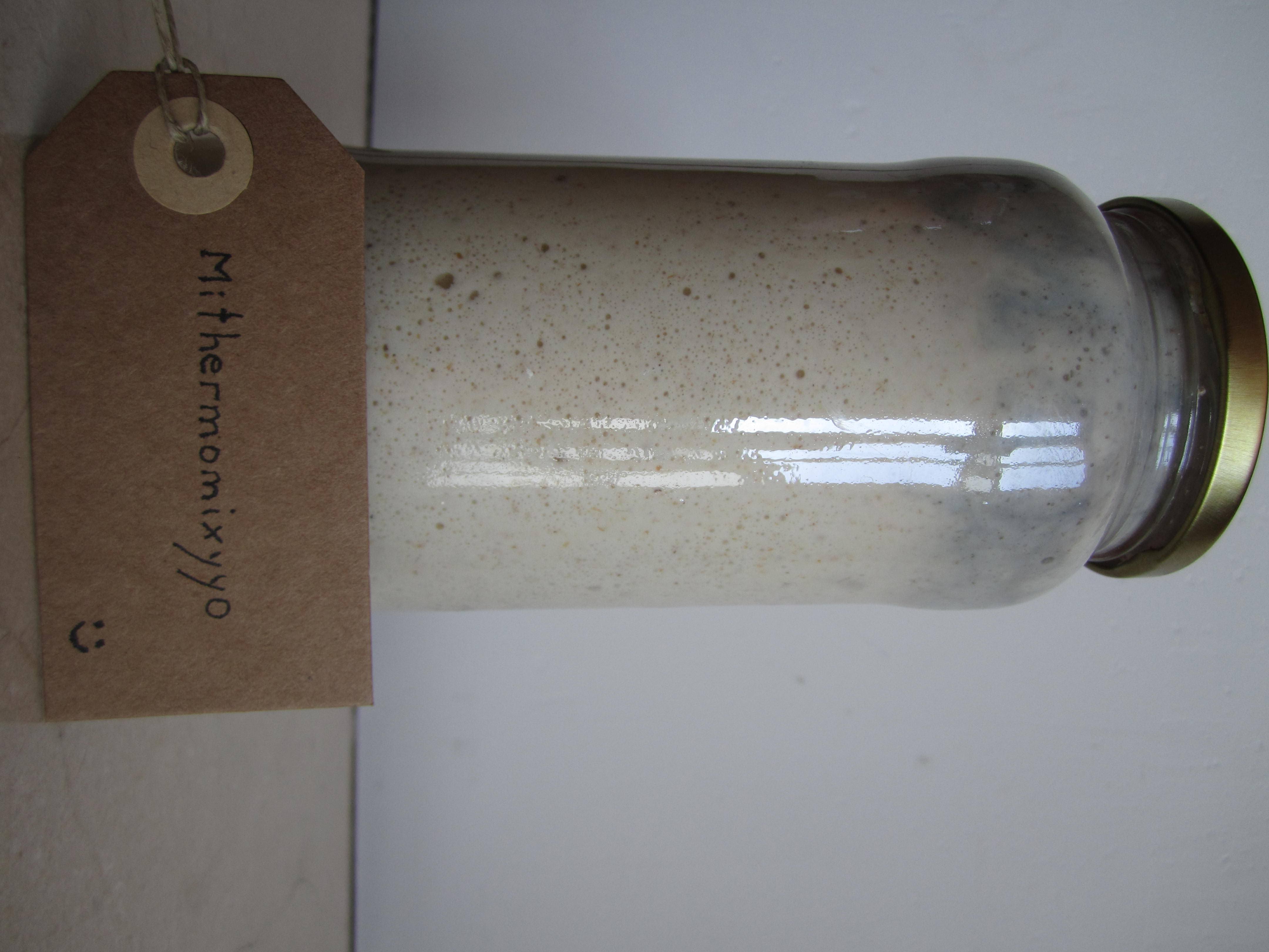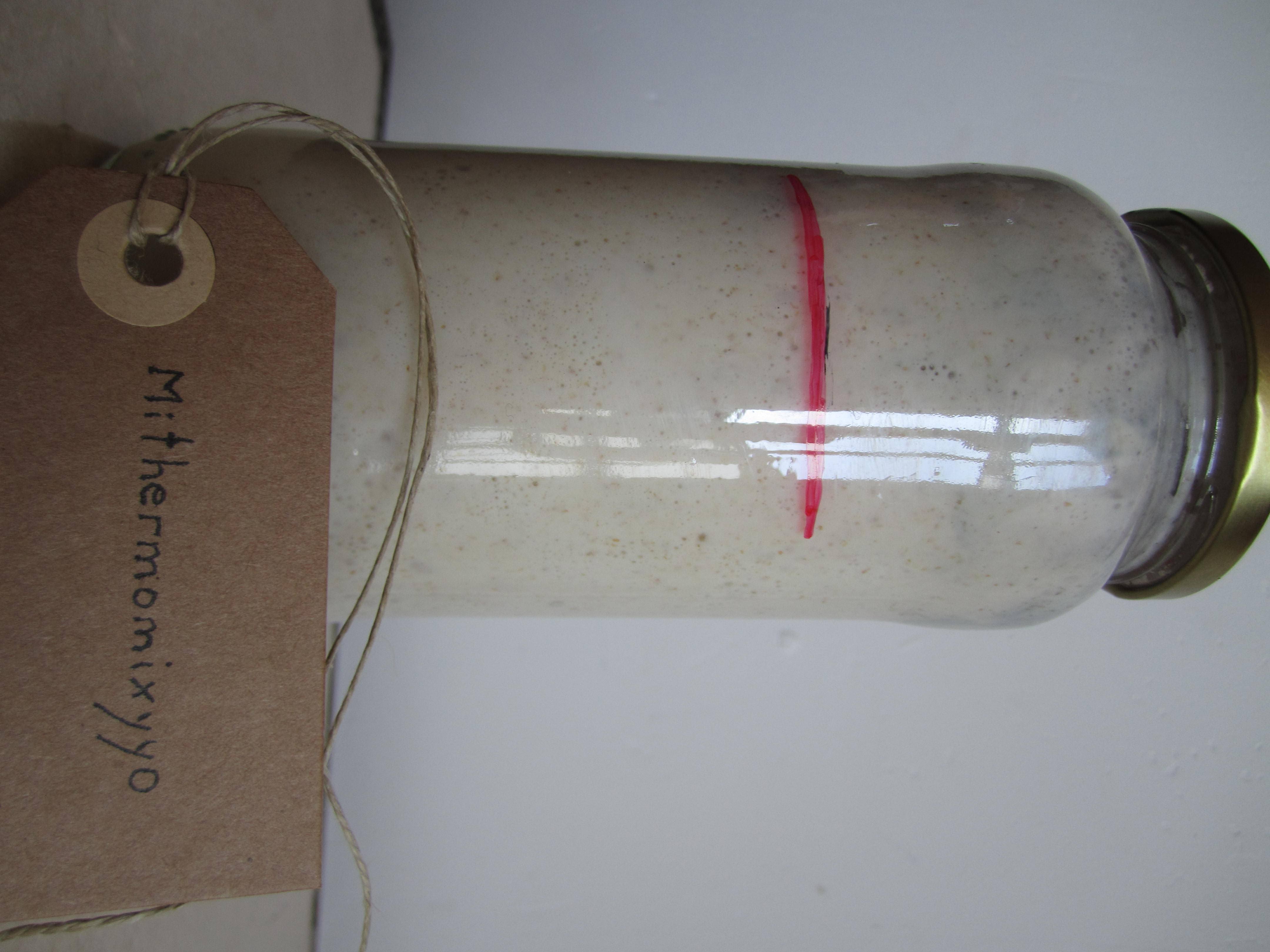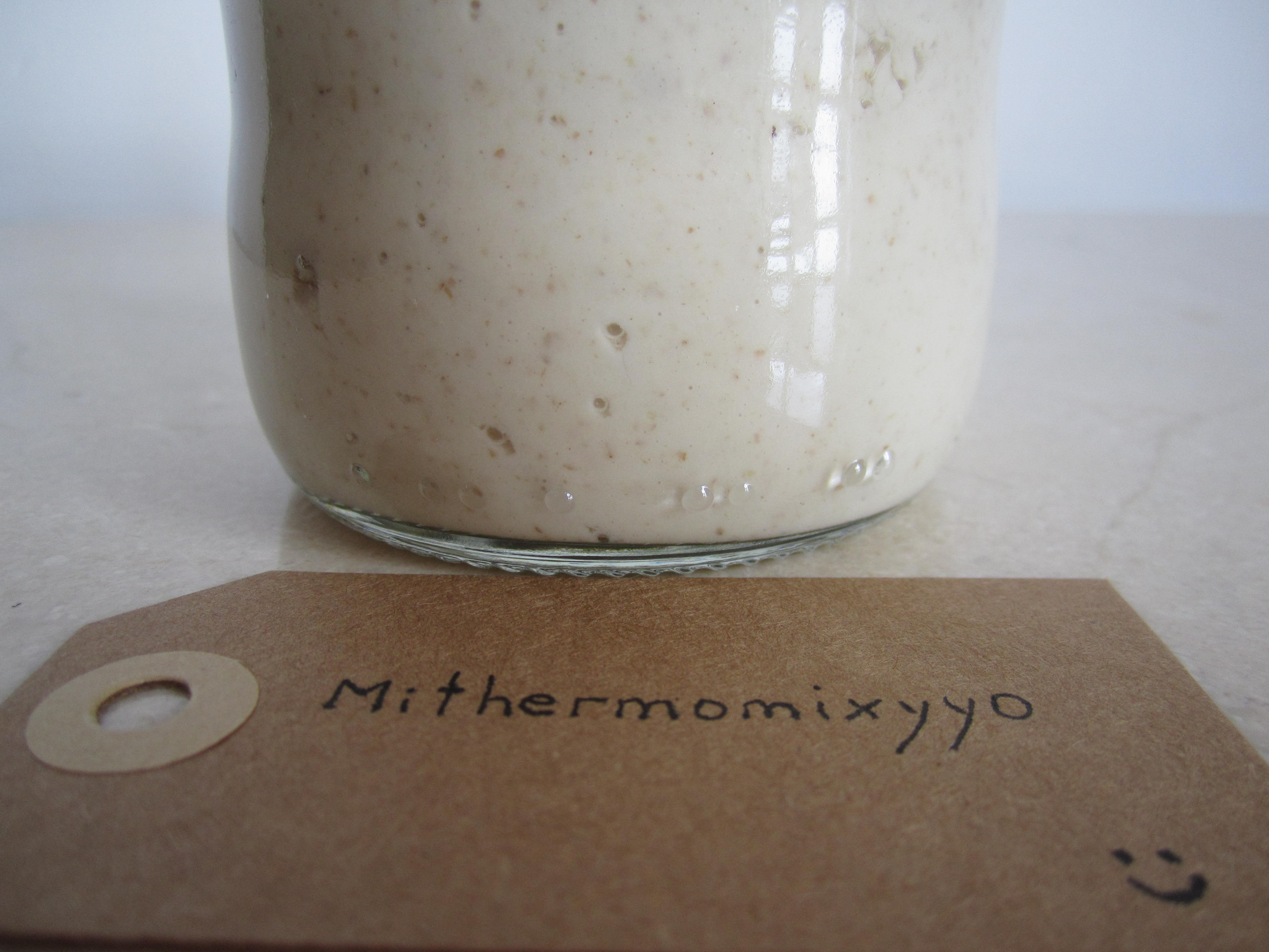 La levadura ocupa el mismo volumen que el día anterior pero ha formado un líquido marrón por encima. No se aprecia la fermentación. Coloca el tarro sobre la tapa del Thermomix para poder usar la bascula, pesa los ingredientes (agua y harinas) y mezcla bien con una espátula dentro del tarro. Tápalo, marca con un rotulador el nivel y deja reposar otras 24 horas a temperatura ambiente.