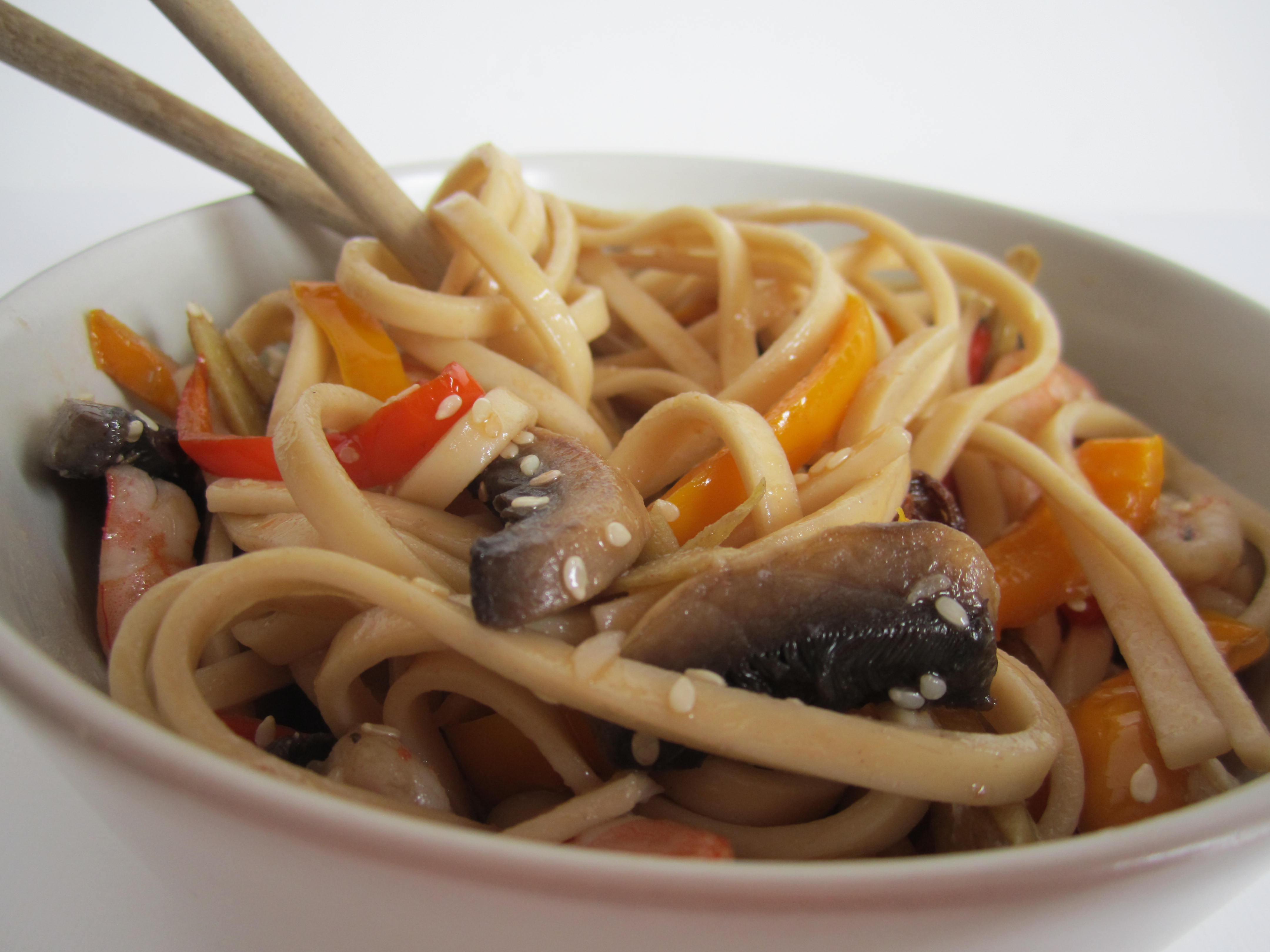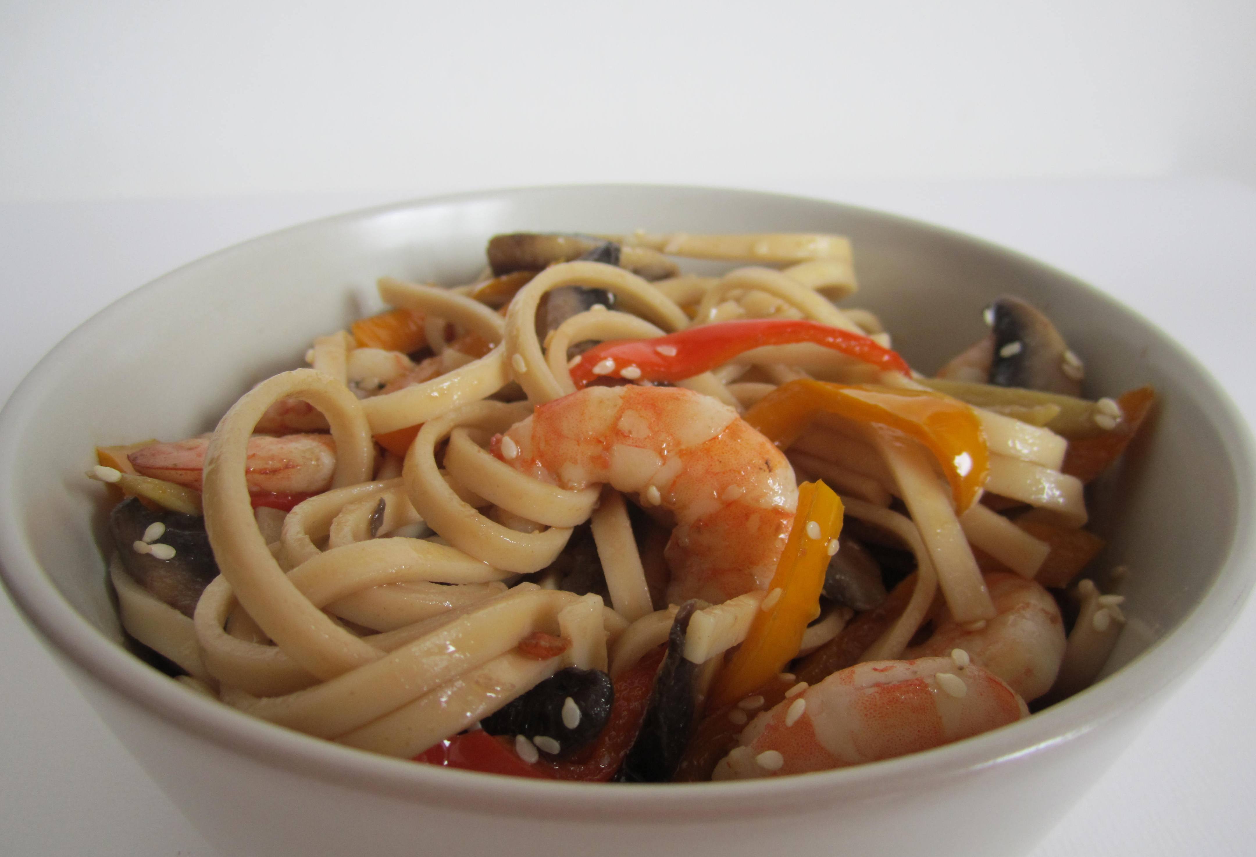 ¿Te apetece probar un plato fácil y sabroso? Si quieres puedes «tunearlo» con otros ingredientes, puedes cambiar las verduras por otras a tu gusto: setas shitake, judías verdes, mazorcas baby, etc. También puedes reemplazar las gambas por pollo, ternera, etc… la base es la misma, unos ricos noodles, un poco de salsa Yakisoba  y lo que más te apetezca. Si quieres puedes contarme como los haces y así intercambiamos recetas