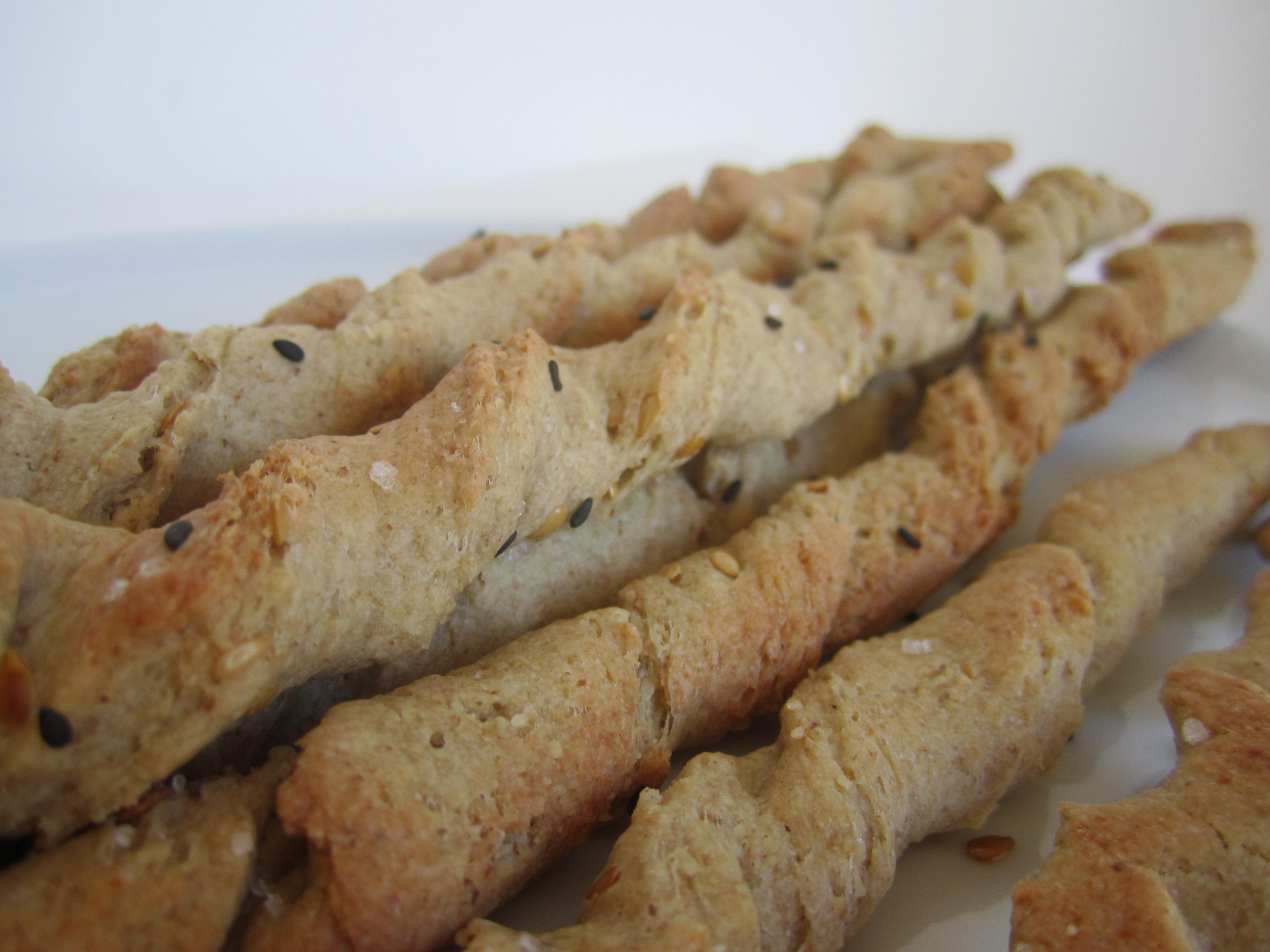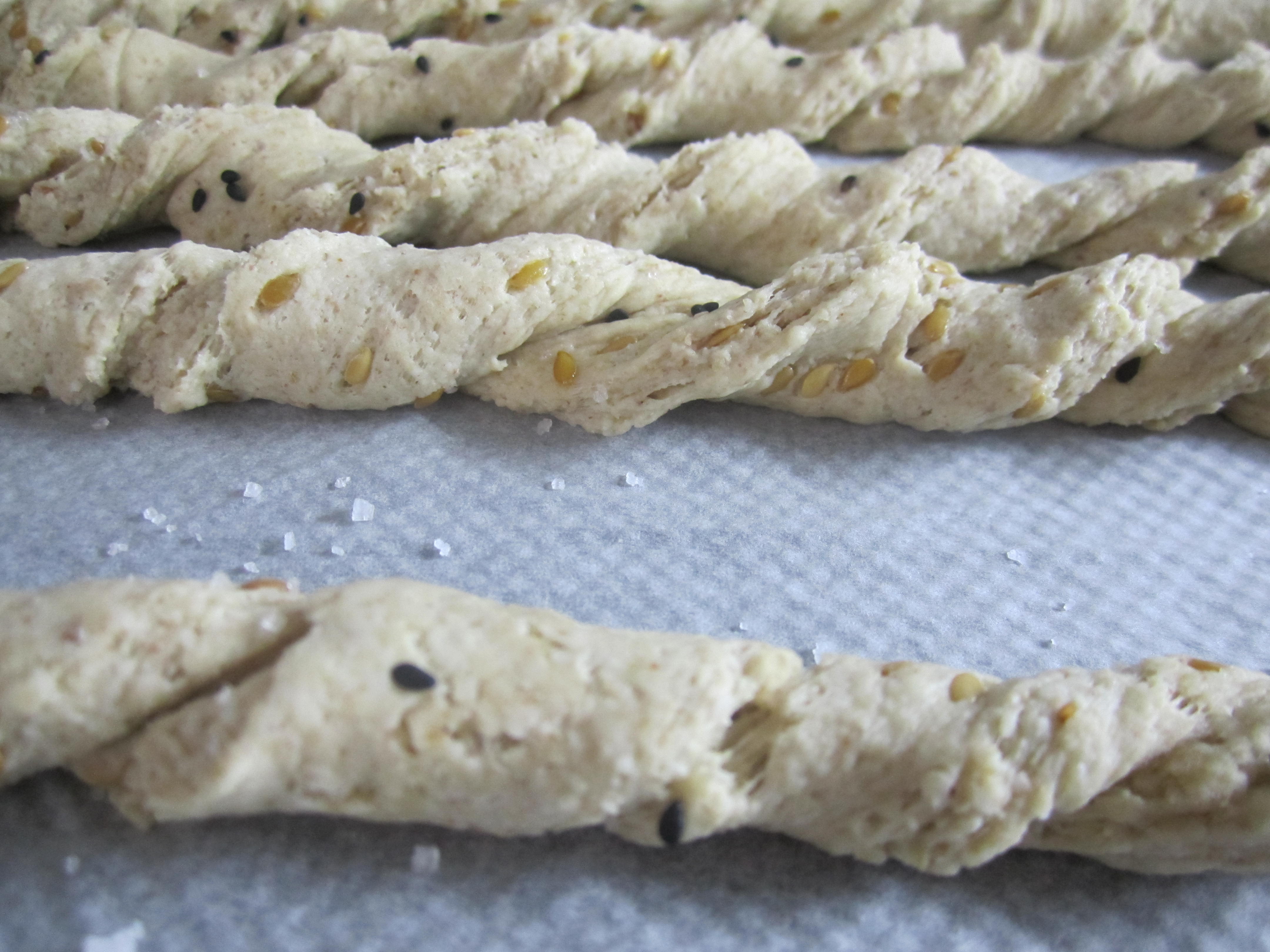 6- Ahora que la masa ha subido, divídela en cuatro trozos y extiende bien con un rodillo para que sea bastante fina y corta en tiras con un cuchillo bien afilado o un corta pizza. Espolvorea con las semillas y la sal y retuercelas antes de hornear (también las puedes dejar estiradas) Ponlas sobre papel vegetal en la bandeja del horno unos 15 minutos aproximadamente.