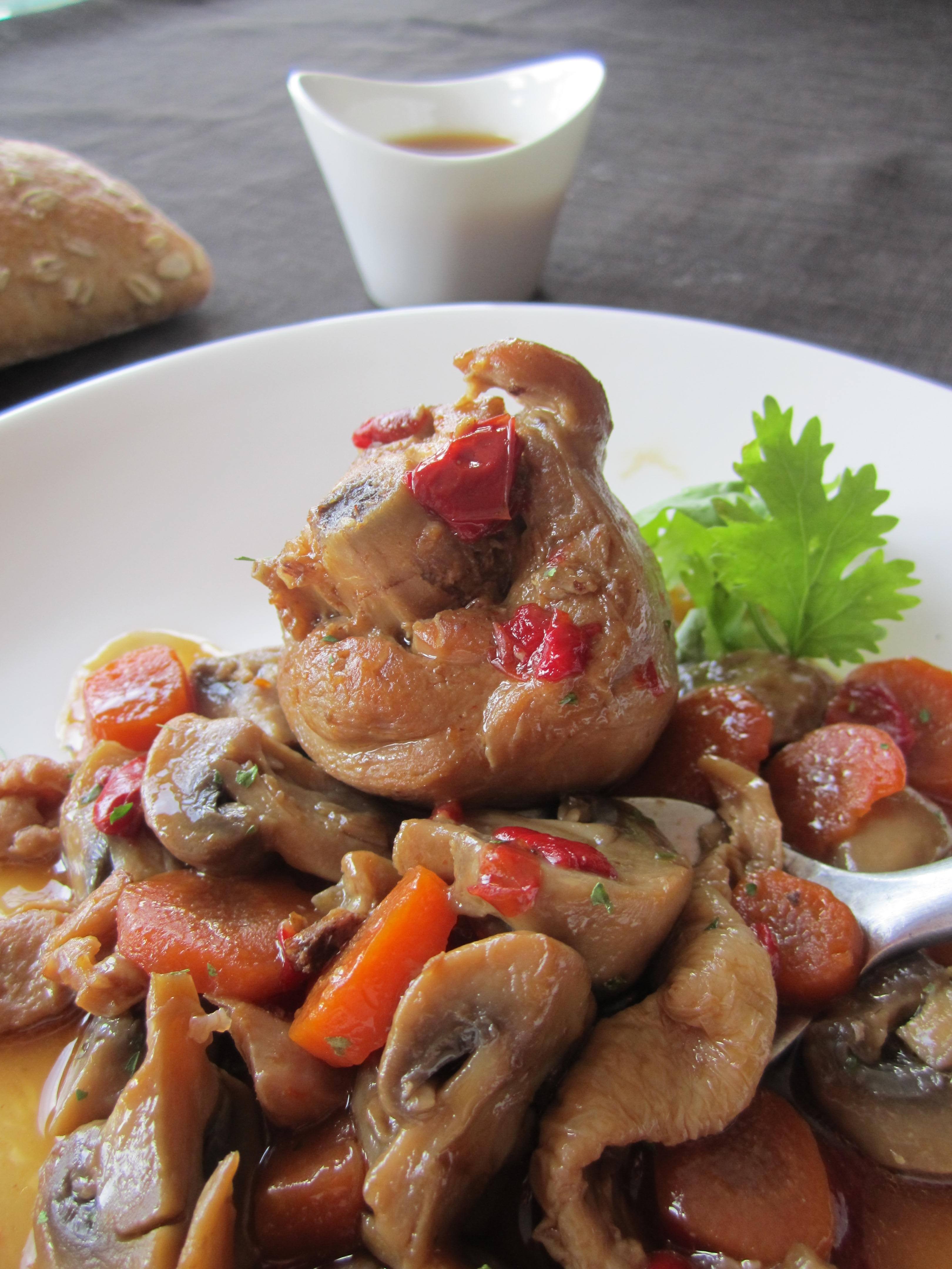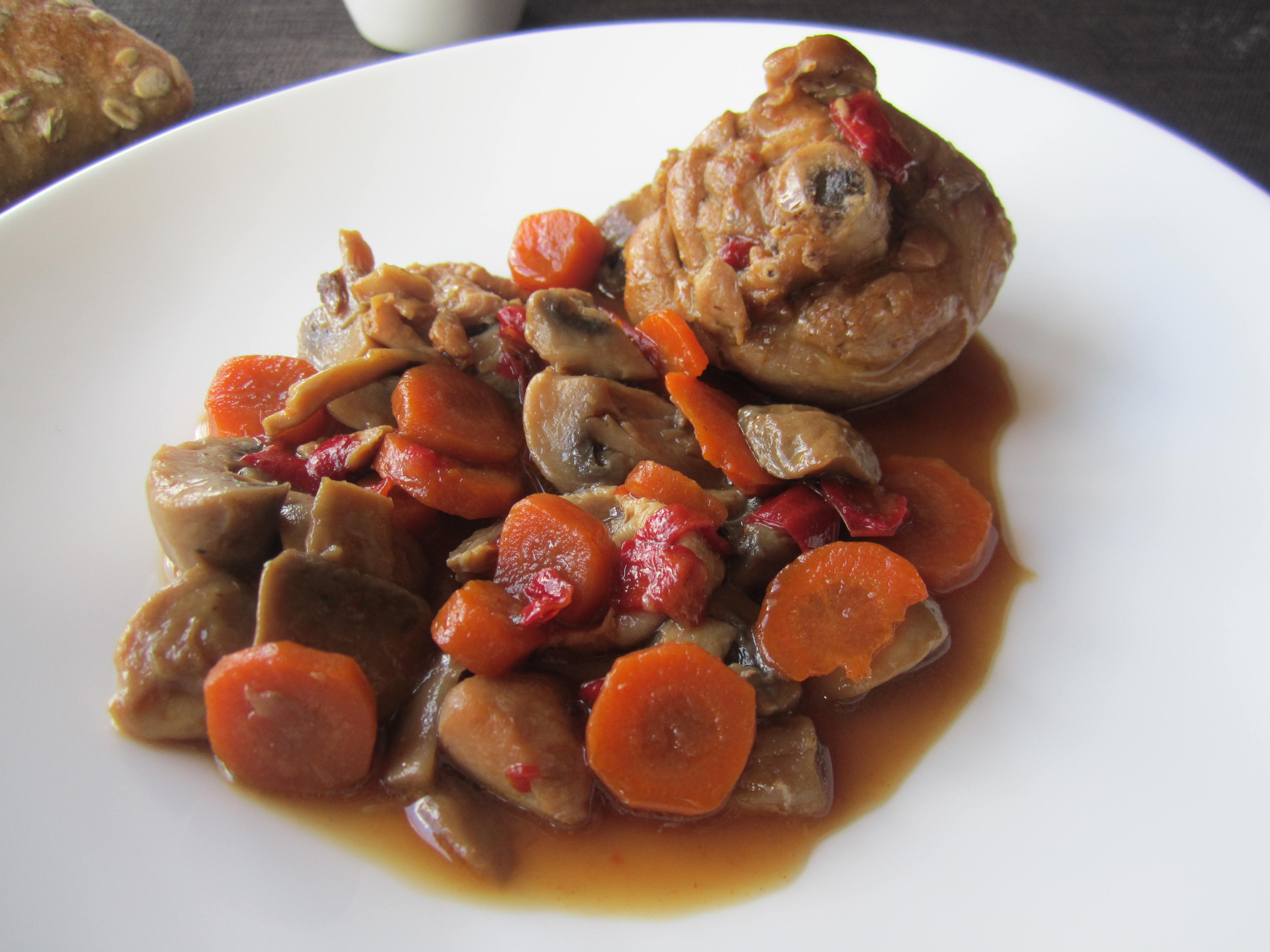 Comprueba que el pollo está a tu gusto o programa unos minutos más. Incorpora las zanahorias y los champiñones al pollo.