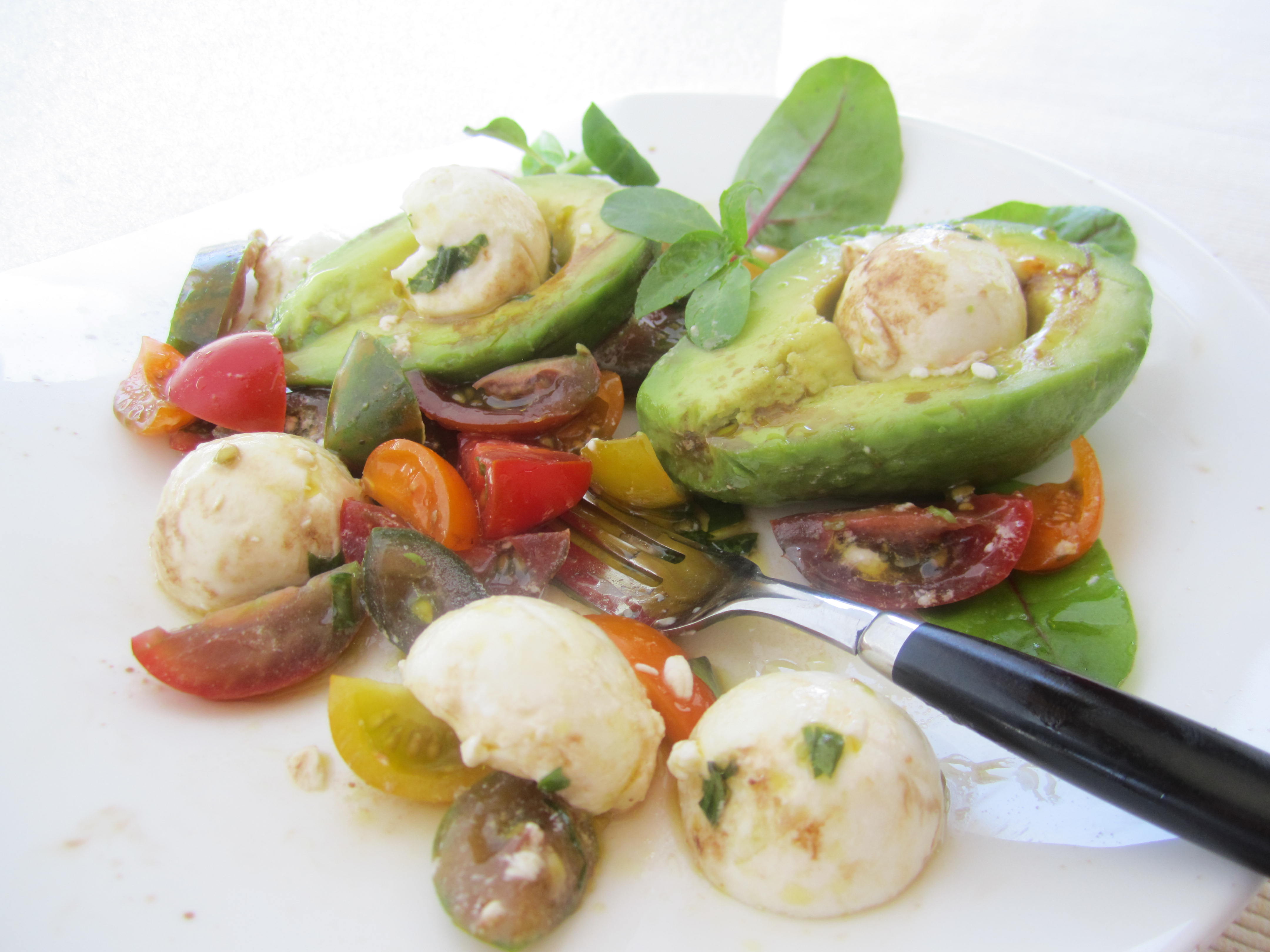 2- Trocea los tomates y el queso.Y pon en un plato con el aguacate y los brotes de lechuga.
