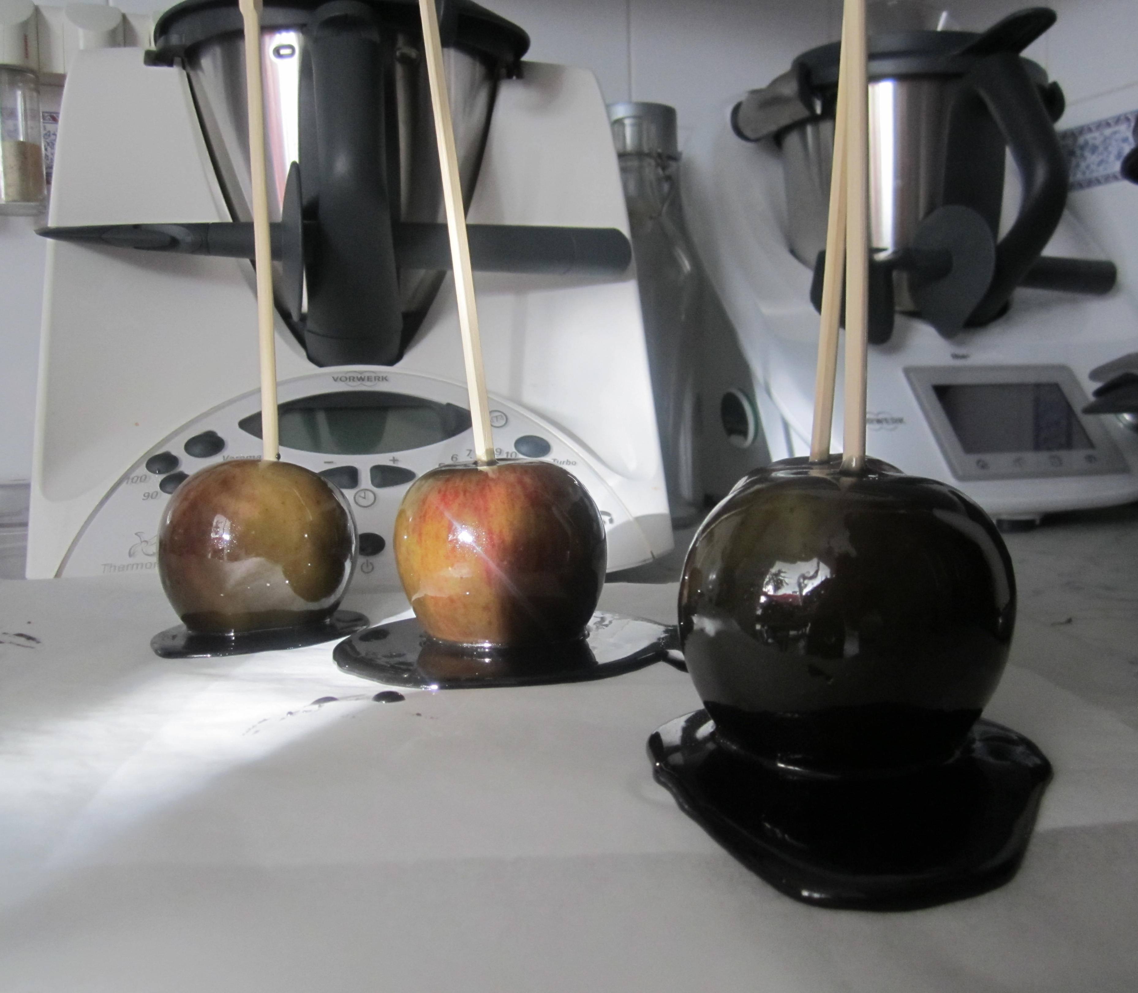 Después de mucho experimentar y probar distintas recetas para ver el color y el brillo, me he quedado con un verde oscuro «venenoso». También ha sido la única en la que el caramelo no escurría sin más y dejaba un aspecto pringoso. Por eso la ganadora es «tachan, tachan» La recta más tradicional sin mantequilla. Puedes hacerlas de colores diferentes, las negras son muy vistosas, pero las verdes oscuras tampoco están nada mal.