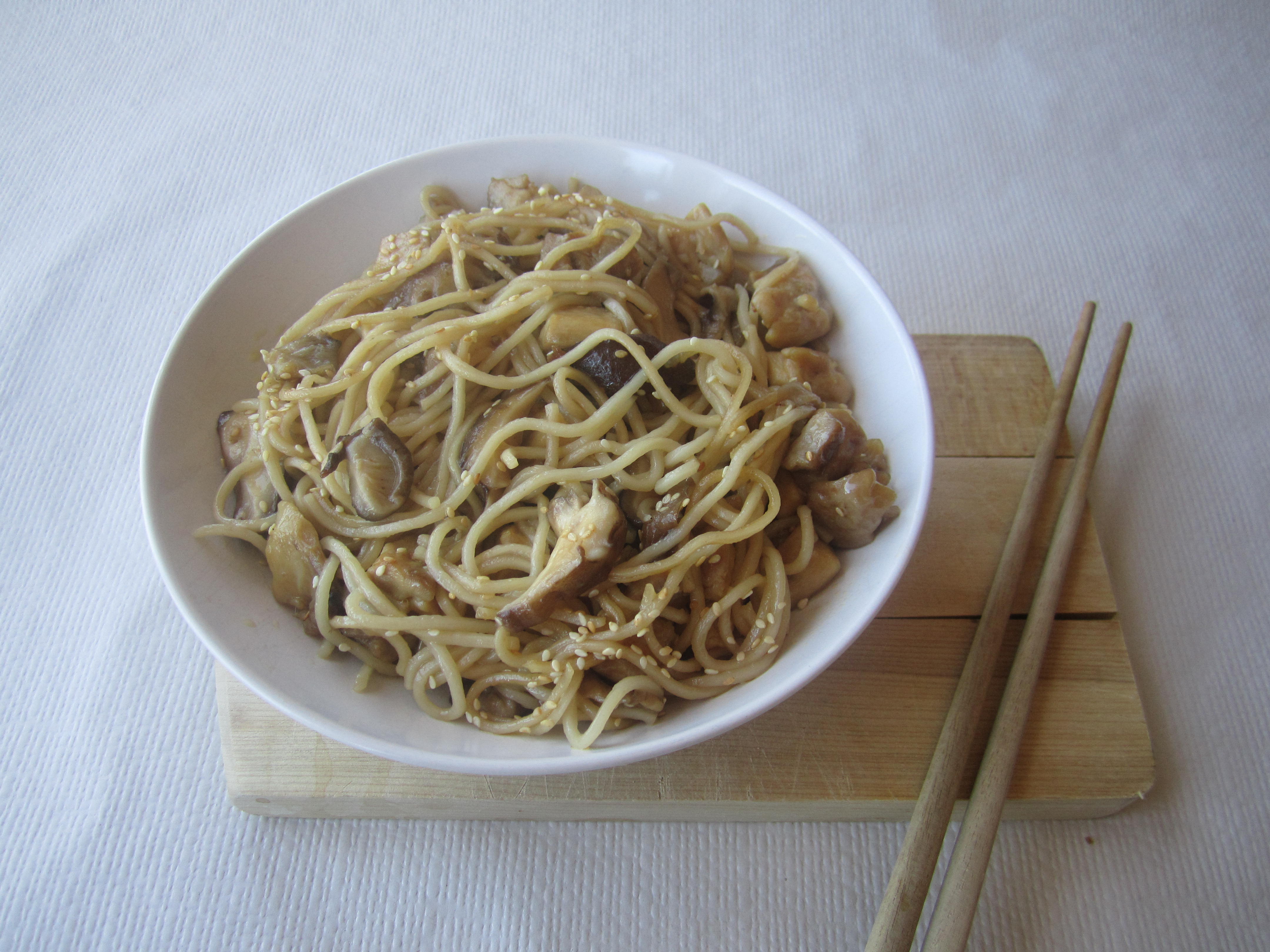 ¿Os apetecen unos fideos ricos y fáciles? La verdad es que no hace falta usar la Thermo para esta receta, si salteas el pollo, la cebolleta y las setas en un wok o una sartén y cueces la pasta el resultado será buenísimo. Pero os dejo una versión con máquina para que podáis elegir. Espero que os guste.