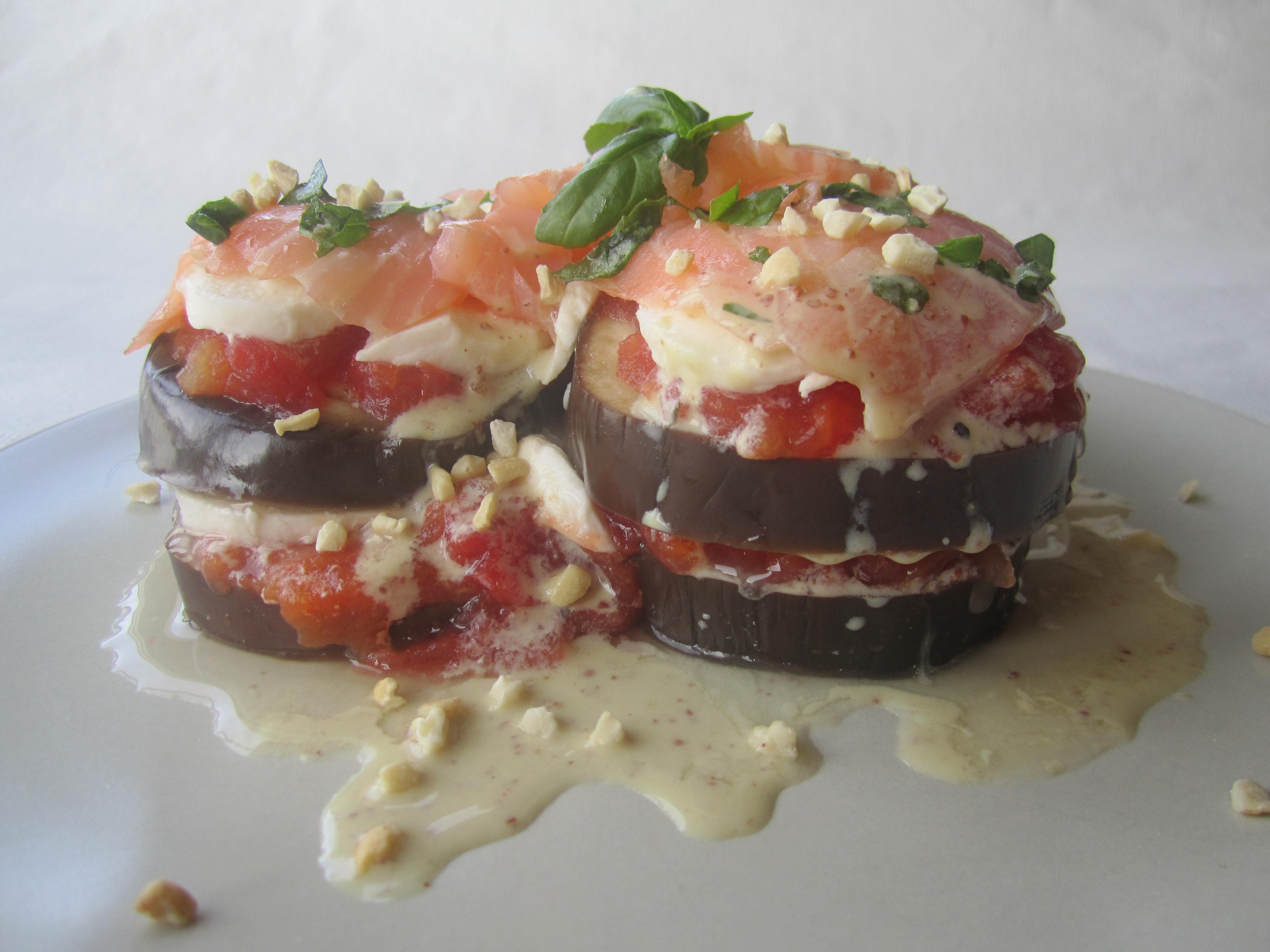6- Corta la mozzarella en rodajas y empieza a montar el plato por capas. No olvides poner sal a la berenjena y el tomate, pon una rodaja de berenjena, tomate y una de mozzarella. Termina colocando una loncha de salmón ahumado.