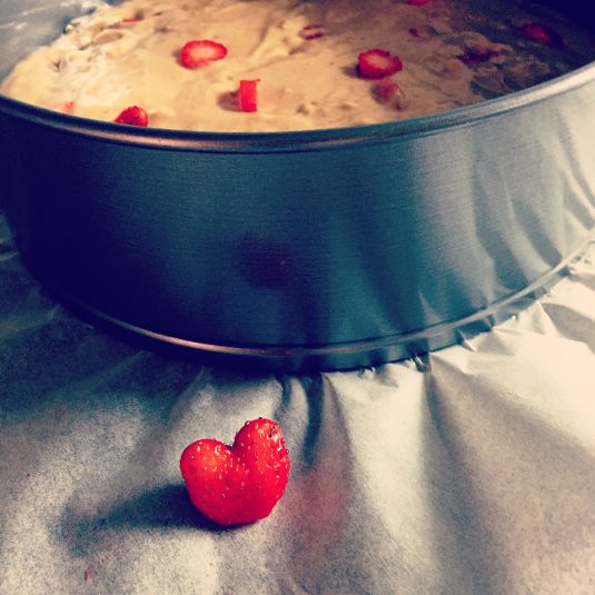 7- Incorpora las fresas y termina de envolver la masa con la espátula con movimientos suaves, vuelca en el molde.