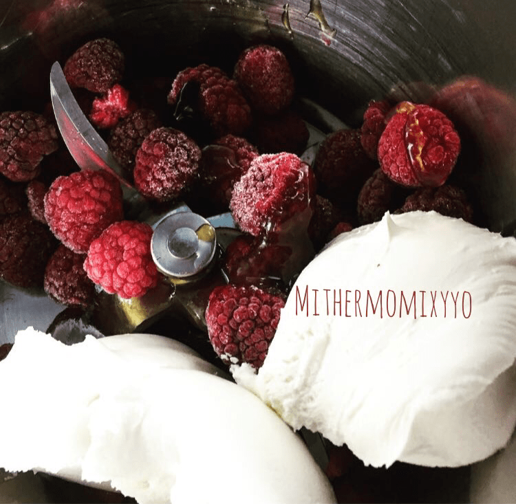4- Pon en el caso de tu Thermo las frambuesas, la miel y el queso Mascarpone. Tritura a velocidad progresiva 5/10 un minuto. A mí me gusta que quede un poquito de textura.