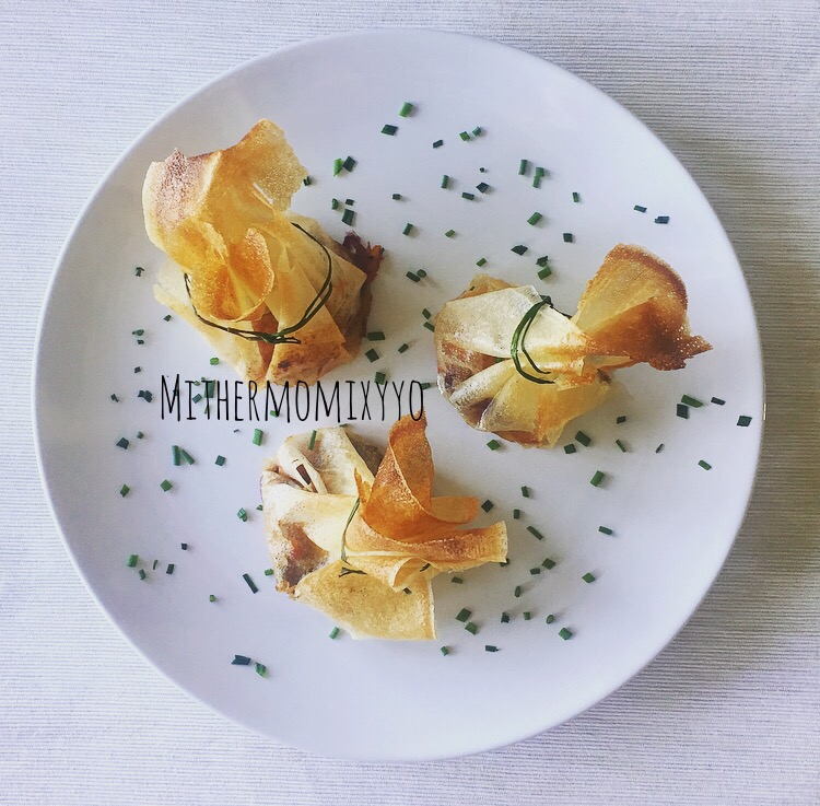 7- Cierra los saquitos con un par de tiras de cebollino. Pinta cada saquito con un poquito de mantequilla derretida y mételo al horno a 200º calor arriba y abajo. (Es importante que la bandeja del horno la tengas preparada con papel de hornear para evitar que se queden pegados los saquitos)